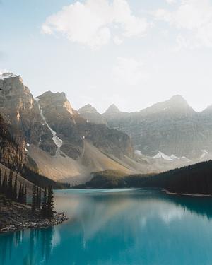 Calm evening in Banff National Park with the sun's rays spilling through the valley