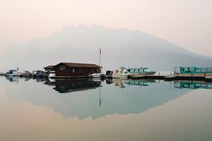 An eerie atmosphere over Lake Minnewanka caused by nearby forest fires