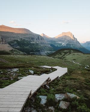 Sunset in Glacier National Park with the last bit of sunlight reaching the peaks